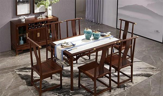中國人講究團團圓圓,家和萬事興。餐桌是血脈的延續(xù)也是禮儀的課堂。大體框架選用烏金實木,桌面別具用心選擇大理石,古今相遇,即是長輩與晚輩的相處,如此融洽又各具特色。
