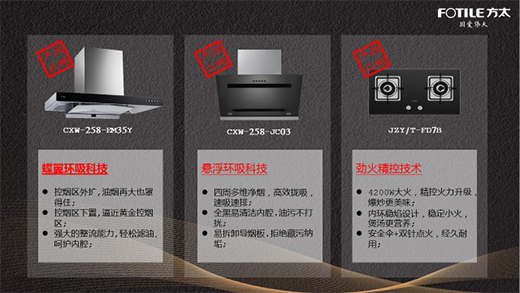 在家裝節(jié)的最后,方太武漢培訓(xùn)部夏秀芳向與會人員展示了方太“黑科技”——分別運用了蝶翼環(huán)吸科技和懸浮環(huán)吸科技的兩種不同型號的新款油煙機。蝶翼環(huán)吸科技,能夠?qū)崿F(xiàn)控?zé)焻^(qū)外擴,油煙再大也罩得住;控?zé)焻^(qū)下置,逼近黃金控?zé)焻^(qū);強大的整流能力,輕松濾油、呵護內(nèi)腔;而運用了懸浮環(huán)吸科技后,能夠?qū)崿F(xiàn)四周多維凈煙,高效攏吸,速吸速排;全黑易清潔內(nèi)腔,油污不打擾;易拆卸導(dǎo)煙板,拒絕藏污納垢。還有運用了勁火精控技術(shù)的燃氣灶,4200W大火,精控火力升級,爆炒更美味;內(nèi)環(huán)穩(wěn)焰設(shè)計,穩(wěn)定小火,煲湯更營養(yǎng);安全傘+雙針點火,經(jīng)久耐用。