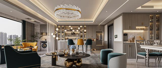 客廳高級(jí)時(shí)尚的配色給予空間活潑輕奢的格調(diào)。設(shè)計(jì)師將嚴(yán)謹(jǐn)?shù)脑O(shè)計(jì)理念,和對(duì)美學(xué)的思考融入其中。盡可能提高儲(chǔ)物收納功能,增加空間利用率。