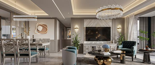 餐廳灰白的色調(diào)加上輕奢風(fēng)格的水晶吊燈,光影滲透每一寸空間,使空間的格調(diào)感氛圍感更加強(qiáng)烈。