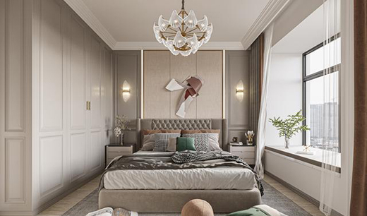 臥室采用高級(jí)灰和米白相結(jié)合,配色優(yōu)雅高貴,加上藝術(shù)造型金屬吊燈,透露出低調(diào)的奢華感。墻面采用了美式常用的護(hù)墻板,線條簡(jiǎn)單,把控的剛剛好。
