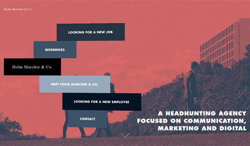 雙色調(diào)顏色的選擇并不會使文本變得十分明顯,而是以一種更溫和卻足以為目標(biāo)服務(wù)的形式表現(xiàn)出來。Holm Marcher & Co.公司做的這個珊瑚藍雙色很有趣,而且創(chuàng)造了文字高度可讀的背景。另外,導(dǎo)航元素使用的藍色色調(diào)使畫面變得更有活力了。