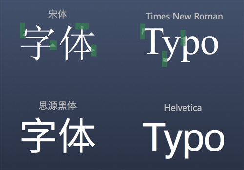 在西方國家的字母體系,分成兩大字族:serif(襯線字體)及sans serif(無襯線字體)。襯線字(下圖中的宋體、Times New Roman)是指在字的筆畫開始及結束的地方有額外的裝飾,而且筆畫的粗細會因直橫的不同而有所不同。 相反的,無襯線字(下圖中的思源黑體、Helvetica)就沒有這些額外裝飾,而且筆畫粗細大致上是差不多。