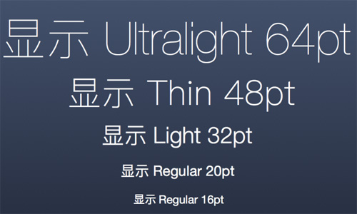 當字體大小為12-18pt時,使用Regular,18-24pt時,使用Light,24-32pt,使用Thin,當字體大小超過32pt時,建議使用Ultralight。以上都是建議值,你應該根據不同字體的顯示效果進行設定使文字內容看上去清晰和精致,從而保持良好閱讀體驗。