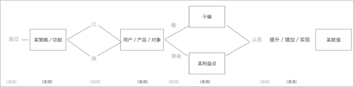 我個人覺得這個定義已經(jīng)屬于哲學(xué)層面的概念,理解起來還是比較抽象和復(fù)雜的,我自己讀過很多遍這段內(nèi)容但在分析時還是很難運用起來,而且很多項目其實只有一個總體的目標(biāo)并不會細化到這樣的顆粒度。于是我去我們平臺查閱了一些設(shè)計師的分析部分內(nèi)容,整理組織一下發(fā)現(xiàn)大致的信息是這樣的: