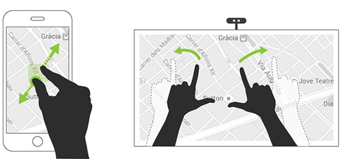 觸碰屏幕時(shí),觸點(diǎn)就是起點(diǎn)——一個(gè)參照點(diǎn)。想象一下,典型的雙指縮放和雙手隔空構(gòu)成類似的操作,兩者有什么區(qū)別??s放等級(jí)的參考點(diǎn)變得模糊不定。你也不能松開(kāi)屏幕來(lái)停止操作,所以起始點(diǎn)和結(jié)束點(diǎn)都變得模棱兩可。