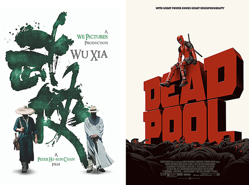 上左圖將書法的“武俠”二字作為畫面主視覺進(jìn)行處理,而右圖則直接將死侍坐在類似3d處理后的電影名字上,很好的融入到了畫面中。運(yùn)用到網(wǎng)頁(yè)設(shè)計(jì)當(dāng)中如下: