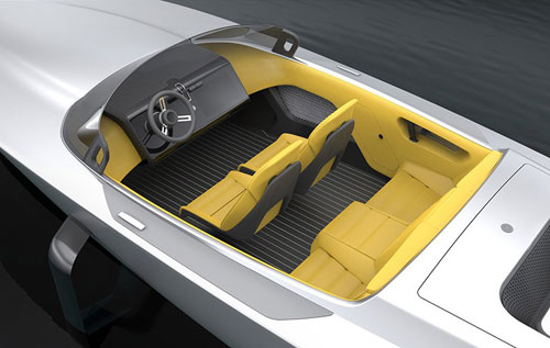 耀眼的黃色輪轂看起來非常時(shí)尚,同時(shí)又保證了寬敞的空間以及井井有條的布局設(shè)計(jì)。前面的座椅采用上翻式坐墊,能夠欣賞到更美的海上風(fēng)景。其內(nèi)飾設(shè)計(jì)還隱藏有不少的儲存空間,以及照明與音響系統(tǒng)。船上所有的數(shù)字儀器都被放在玻璃觸屏的儀表板后面,極具創(chuàng)新的引擎室——帶有電動機(jī)與多個(gè)電池組——可以從后方甲板的窗戶中看到。