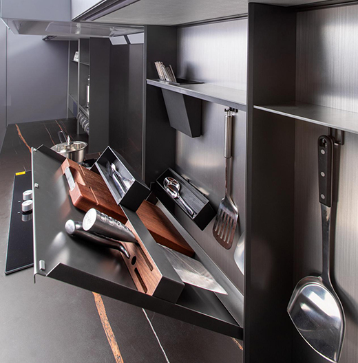 構造上,中柜系統(tǒng)集成了掛鉤、隔板、軌道插座、翻蓋插座、調(diào)味模塊、下翻刀叉和玻璃移門中柜7大功能模塊,被稱為廚房智慧收納的2.0版本。