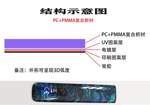 復(fù)合板材大多是用PC\PE\ABS\PMMA料做多種工藝流程處理,從而表面效果具有很強(qiáng)的裝飾性,在前兩年前左右很多手機(jī)商在手機(jī)的背殼上做復(fù)合板材的裝飾工藝,現(xiàn)的一些低端品牌仍使用復(fù)合板材做工藝(電鍍漸變色,電鍍膜 等等),復(fù)合板材進(jìn)行工藝處理后在裝飾上有驚人的表現(xiàn)能力,有年輕活力的感覺。復(fù)合板材的厚度在0.5~0.8mm最合適,弧度過大會增加貼膜難度,可實(shí)現(xiàn)性難。