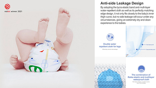 陳家勝同學(xué)設(shè)計的Anmous Living Baby紙尿褲首次采用尿布與寶寶皮膚的PH值完全匹配的Anmous Living Baby Diapers親膚PH 4.8無紡布材料。作為一次性消耗品,這種完全可生物降解的SAP材料丟棄后不會造成環(huán)境污染;3D壓紋工藝形成的凹凸透氣網(wǎng)狀表面,在寶寶皮膚和尿布之間形成了一個空氣通道,提供前所未有的透氣性和最柔軟的舒適性;尿布上的濕度指示器可以提醒父母及時更換,給寶寶帶來更舒適的穿著體驗。