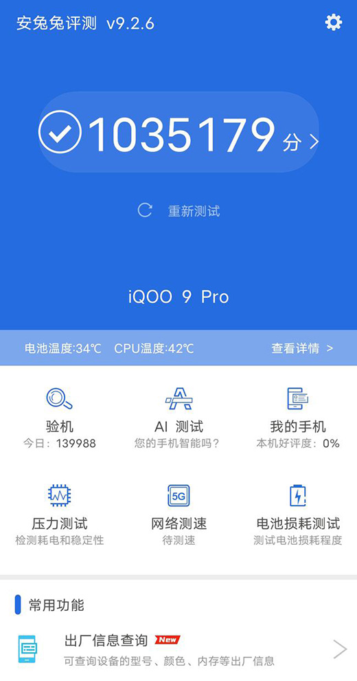 除了外觀設(shè)計驚艷之外,iQOO 9 Pro賽道版在核心配置方面也有亮眼表現(xiàn)。它搭載了高通全新一代旗艦芯片——驍龍8 Gen 1,該芯片擁有出色的運行性能和圖形渲染能力,配合超頻版UFS 3.1和增強版LPDDR5等硬件,能夠進一步提升手機的運行表現(xiàn)。同時,該機還搭載獨立顯示芯片 Pro,不僅能夠通過游戲插幀的方式提升游戲的畫面流暢度,還可以降低游戲場景下的功耗。經(jīng)過跑分實測,iQOO 9 Pro的安兔兔跑分成績超過了103萬,這足以證明其性能實力之強。