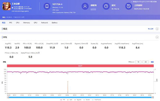 而在游戲測試環(huán)節(jié)中,iQOO 9 Pro賽道版也有著出色的表現(xiàn)。從下圖可以看到,該機在運行120幀《王者榮耀》時,平均幀率達到了118.3,幾乎接近滿幀狀態(tài),并且?guī)是€較為平緩,整個游戲過程非常流暢。