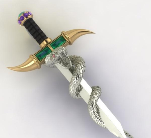 David Kirk 設(shè)計(jì)的劍型吊墜獲得“零售商年度最佳獎(jiǎng)”,這是一件充滿想象力的作品——白金雙刃劍上纏繞一條手工雕刻的金蛇,蛇眼鑲嵌紅寶石,黃金劍格鑲嵌祖母綠寶石,劍柄為黑玉髓,劍首則裝飾紫水晶。