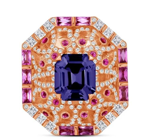AG Gem 寶石公司的一枚緬甸尖晶石戒指獲得“供應(yīng)商年度最佳獎(jiǎng)”。這枚戒指充分展示寶石鑲嵌工藝的繁復(fù)——八邊形戒面形狀與4.38ct緬甸尖晶琢型相同,主石周?chē)糟@石和粉色藍(lán)寶石鑲嵌構(gòu)花卉圖騰,最外圈則采用階梯型切割粉藍(lán)寶和方形鉆石強(qiáng)調(diào)幾何線條,完美對(duì)稱(chēng)的比例創(chuàng)造出強(qiáng)大的視覺(jué)張力。
