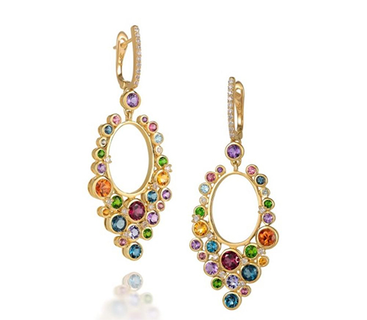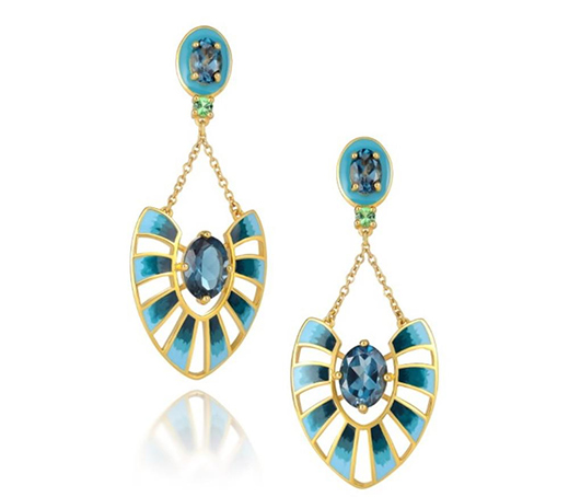 美國(guó)設(shè)計(jì)師 Martha Seely 憑借一對(duì) Apus 耳墜、一對(duì) Solstice 耳墜獲得2個(gè)獎(jiǎng)項(xiàng)。Apus 耳墜靈感來(lái)自星座天燕座,以倫敦藍(lán)托帕石為主石,漸變藍(lán)色琺瑯勾繪出放射狀光芒;Solstice 耳墜以夏至為主題,金環(huán)外圈散落鉆石、托帕石、黃水晶、坦桑石、粉紅碧璽等圓形彩寶,色調(diào)明快而繽紛。