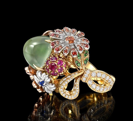 運(yùn)用黃金、白金和玫瑰金制作,主石為一顆9.44ct綠色月光石,點(diǎn)綴鉆石,黃鉆,綠色石榴石,紅寶石和彩色藍(lán)寶石。