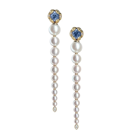 鑲嵌20顆淡水珍珠,1.2ct斯里蘭卡藍(lán)寶石,0.26ct鉆石。