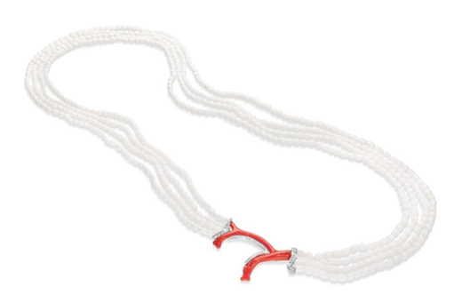鑲嵌紅珊瑚枝和白珊瑚圓珠。
