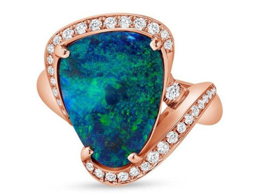 主石為一顆6.05ct澳大利亞歐泊,鑲嵌圓形明亮式切割鉆石。