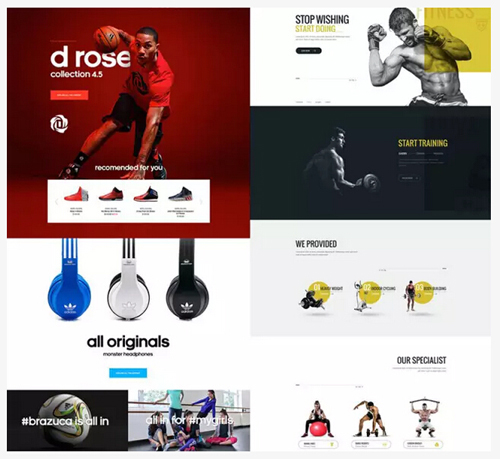 左圖1:模特人物展開(kāi)雙臂運(yùn)動(dòng)的動(dòng)作中,其中拿球的左手位置正好置于文字上,加之文字顏色為白色,使得用戶第一時(shí)間去關(guān)注那部分內(nèi)容。其中右手所示的位置,有一個(gè)扶地的動(dòng)作,而這個(gè)動(dòng)作也正好巧妙的結(jié)合于推薦的商品上,使用戶的視覺(jué)順著向下進(jìn)行瀏覽關(guān)注。