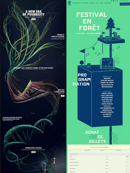左圖1:是典型的綠紅配,整體色調(diào)的綠色化,使得頁(yè)面最底部的紅瓶子顯得格外醒目。在用戶按照從上到下的瀏覽習(xí)慣看完后,視線就被定在了這個(gè)紅色的元素上。