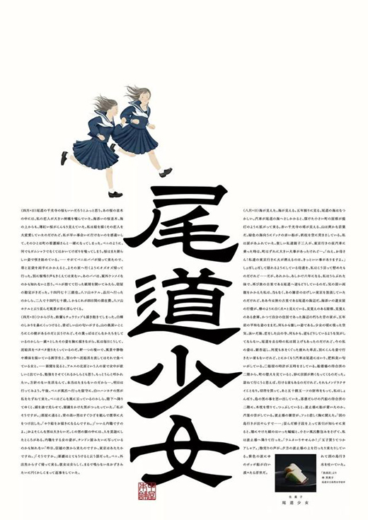 佐藤穂高的另一件海報作品《尾道少女》則融合了廣島附近的一座觀光小城尾道的旅游、動漫以及地方特色果子店的信息,兩位少女形象來自動畫電影《跳躍吧!時空少女》,簡單的文字設計和版式過濾了一片嘈雜的信息海洋,讓原本略顯復雜的信息傳達得準確清晰。