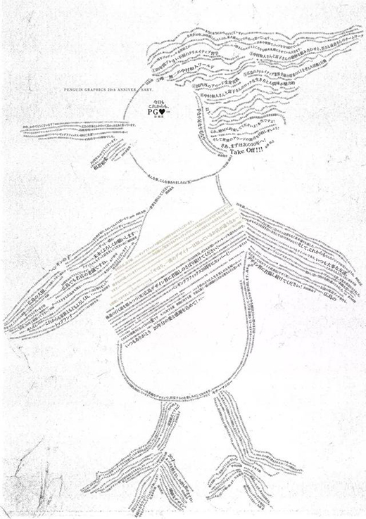 同樣是處理復雜文字和圖形信息,另一件海報作品,谷麻美的《企鵝圖形設計20周年》紀念海報,不僅通過文字傳遞內容,更將文字版式設計成一只企鵝,帶領觀者從其他角度理解圖形設計的幽默感。