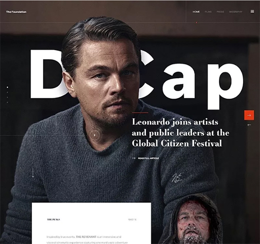 1.增強(qiáng)層次感下面的網(wǎng)站是小李子電影宣傳網(wǎng)站。設(shè)計(jì)師大膽的利用色塊和主視覺人像進(jìn)行重疊,不僅讓文案信息在版面中節(jié)省了空間清晰的展示。而且還給整個網(wǎng)站視覺增加了層次感。真正做到了給用戶有遠(yuǎn)有近的感覺。