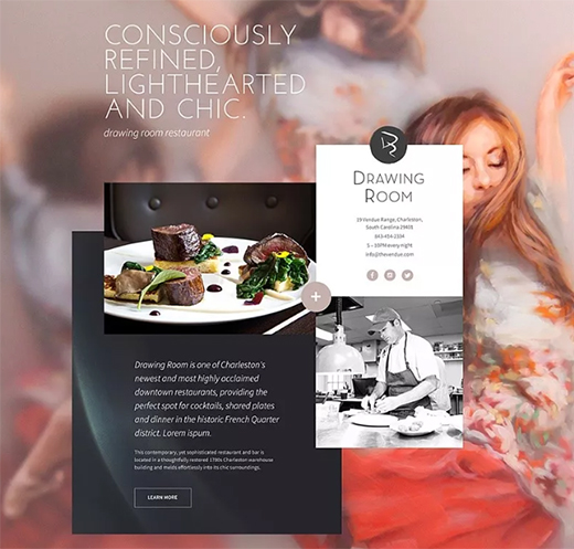 3.強(qiáng)化品牌宣傳下面是一家牛排店的宣傳海報(bào)。設(shè)計(jì)師同樣選取了大的背景圖,讓板塊和圖片之間進(jìn)行重疊搭配,使視覺上做到了極大的突破同時(shí)又能有效的給用戶傳達(dá)出畫面強(qiáng)烈的氛圍。