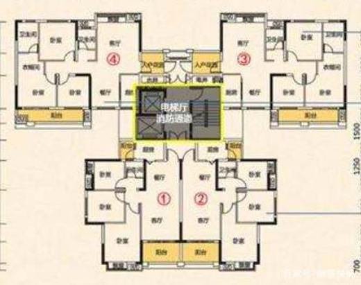 隨著樓層的逐漸升高,突破18層之后,要求配建的東西也變多,需要加防煙樓梯間和消防電梯以及防煙前室,兩部樓梯等。如果還是上面的兩戶設(shè)計(jì),公攤的占比將非常之大,所以我們?nèi)粘?吹缴厦娴脑O(shè)計(jì)都只會(huì)在18層以下的樓棟。由于公攤的增加,造就了三戶四戶的出現(xiàn)。