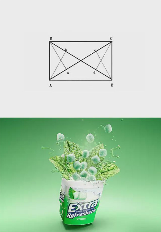 在以1:1.618比例構(gòu)成的矩形ABCD上,畫出對角線AC、DB,并過A、B、C、E4點(diǎn)作AC、EB的垂直線,得垂足a、b、c、d,此法可以簡化尋找美感誘發(fā)點(diǎn)的方法(還是直接看圖吧)。
