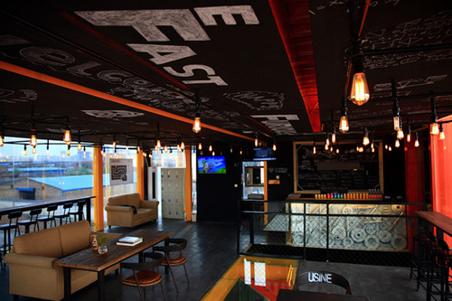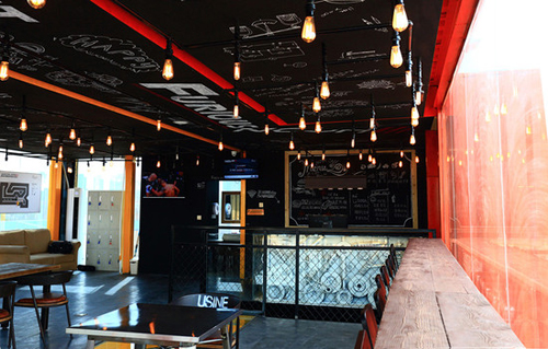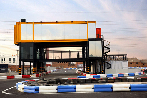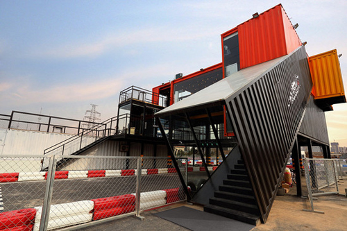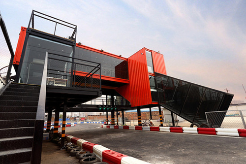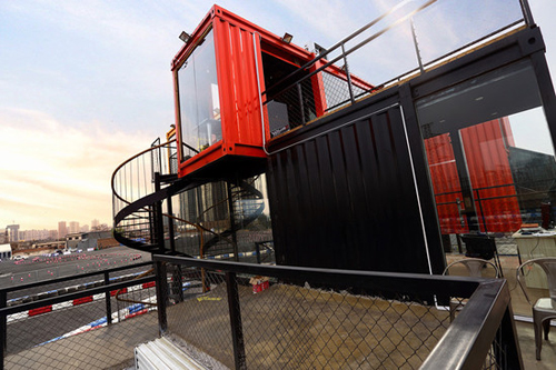 NOVA為新星之意,也是電玩游戲魔獸爭霸中巫妖Lichqueen的標(biāo)志性大招。取名NOVA意在業(yè)內(nèi)施放大招,成為新星熊熊爆發(fā)?! ∽髡哂昧?個集裝箱構(gòu)建了一個三層橫跨賽道的建筑。沿著頂面帶有豐富蠟筆涂鴉的第一節(jié)集裝箱通過兩段樓梯 (樓梯 裝修效果圖)最先抵達的是三樓休息區(qū)和VIP露天看臺,三樓的頂面幾乎也被蠟筆畫占據(jù),仔細(xì)看看這里畫了什么,速度與激情、超人、變形精鋼、半條命,這一個個印在我們兒時不同成長階段的印記,做這些是希望用這些曾經(jīng)令我們?yōu)橹V迷的圖標(biāo)喚醒兒時那顆童心,來到NOVA就撒花兒跑吧。