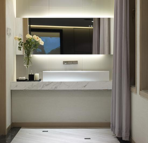度身定做,則是空間內(nèi)最為潛移默化的“加”法。無(wú)論是結(jié)合了古典雅韻與現(xiàn)代酷感的玄關(guān),還是與空間搭配得宜和諧的邊幾、燈飾,甚至是衛(wèi)浴間的垃圾桶、鏡子等等幾乎都由設(shè)計(jì)師依據(jù)空間需要主導(dǎo)設(shè)計(jì)制作的。這樣隱匿的“加法”,極其有效地把控了空間調(diào)性的完整統(tǒng)一,又不會(huì)缺失藝術(shù)設(shè)計(jì)的獨(dú)有魅力。