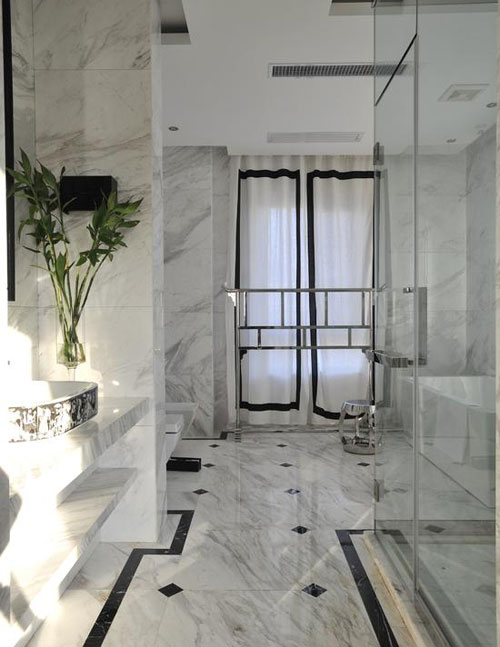 貴州木紋石材鋪就的地面,黑白灰色的暈染效果形成天然的水墨畫,點(diǎn)綴其間的黑色方形拼塊,既呼應(yīng)了邊角的走線,又豐富了視覺(jué)感受。