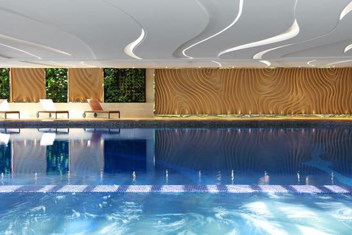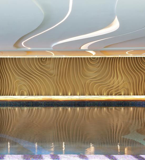 天花板上的水漾與池中湛藍的一片水相互輝映,虛實交錯之感柔化了空間。坐在此處,看一頁書,品一杯香茗,享一刻的愜意,平衡了生活。