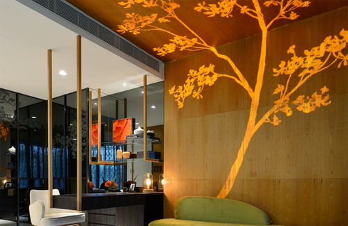 為了將綠意延伸到整個住宅,于是在墻壁上做了一棵發(fā)光的樹,樹蔭之下很有寫意之感。每一個角落都有著園林藝術(shù),即使在這樣一個小小的房間里,也可以營造出亭臺樓閣的閑適。