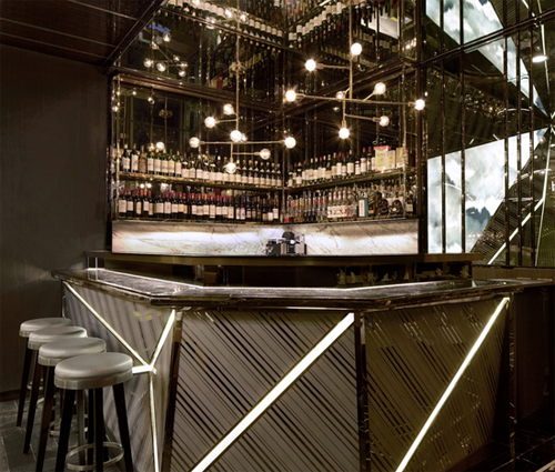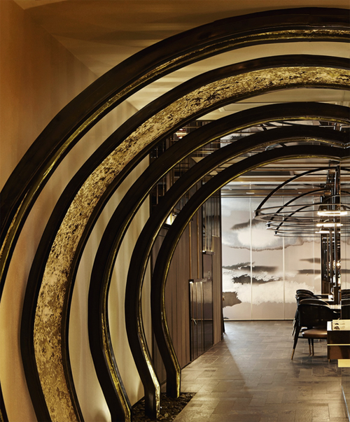 在何宗憲先生的理念里,園林的實與虛,就是山與水。從吧臺延伸到整個墻壁,是設(shè)計師打造的一座假山,綿延而上,給人山外有山的感覺。山水環(huán)繞才顯意境,此處設(shè)計師用云來表現(xiàn)水的概念。水墨畫中的云霧,繚繞在山間,園林于虛實之間獲得著美。