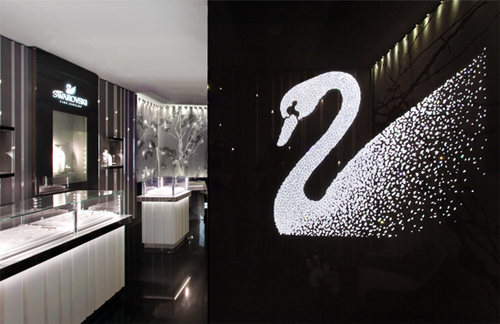 現(xiàn)代化的冰冷材質(zhì)與東方文化的溫度相融,空間便有了故事也有了味道。墻上那只美麗的天鵝不再停留于logo的角色,它是生動的,正在竹林中自由的行走。