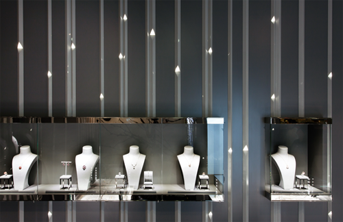在對某珠寶店的設(shè)計中,何宗憲先生將竹林移進了店內(nèi),然后在每一枝竹子的表面都切出了多個鉆石的形狀,配合顏色閃爍出鉆石的光。
