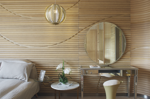 從地面綿延至墻壁,再到吊燈與桌椅,這間臥室對竹工藝的演繹可謂淋漓盡致。而一片圓形掛鏡映現(xiàn)著竹門與竹柜,給人亦實亦虛之感。全竹世界里,有著離俗的清凈,不去別處,只住這里,一片安然。