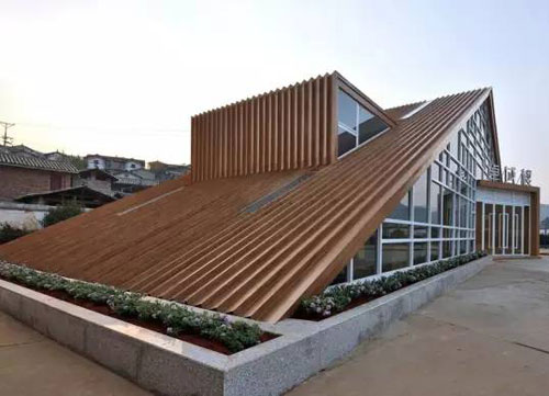 設(shè)計師殷艷明將彝族“坡屋頂”的傳統(tǒng)民居形態(tài)應(yīng)用到該建筑上來,錯落有致的立面輪廓與暖色的仿木紋彩鍍鋼板為建筑賦予更多的現(xiàn)代感。不遠(yuǎn)處的民居代表著過去和歷史,“第三空間”象征著當(dāng)下和未來,通過傳統(tǒng)民居與現(xiàn)代的對比,在空間的軸線和緯度上讓人感受一脈相承的地域文化。第三空間的有機形態(tài)與村落的自然形態(tài)融為一體,室外自然環(huán)境與室內(nèi)空間色彩相互滲透。