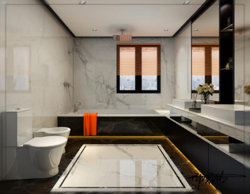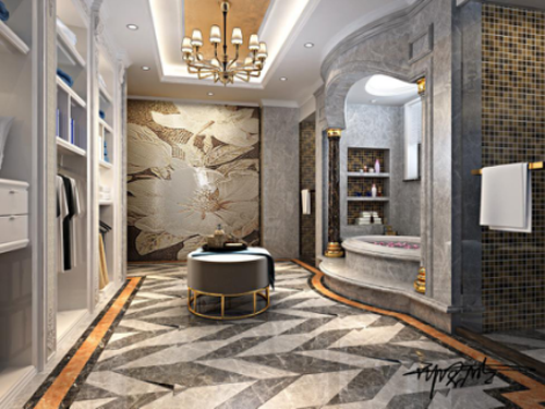 衛(wèi)生間是許多人在裝修中所忽略的地方。其實,衛(wèi)生間的裝修不僅影響整個居室的氛圍,也對居室的環(huán)境起著重大作用。衛(wèi)浴室的四周墻以灰色紋絡狀的大理石為鋪貼,復古的地磚很有歐式風格的特點,精美的水晶吊燈也盡顯奢華感。采用現(xiàn)代風格的歐洲壁畫,打造出莊重大氣的感覺,同時也提高居室整體的藝術感。此外,邢君明特意將浴缸的位置設計為高于其他地方,細節(jié)處令人感到舒適。