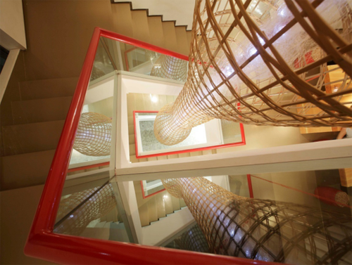 走進(jìn)白馬湖11號(hào),你會(huì)發(fā)現(xiàn)兩種有趣的裝飾:不斷穿梭的紅繩,以及到處懸掛的竹籠。這樣的設(shè)計(jì),基于謝天的兩種心思:翻繩游戲是童年的記憶,紅繩的穿梭不僅能拉伸空間,而且變幻形態(tài),達(dá)到移步換景的奇妙視感?;\子雖是燈具,但更像生活:當(dāng)人們感到累了,便從洞口游出去,“偷的浮生半日閑”;回來(lái),則依然繼續(xù)編織生活。