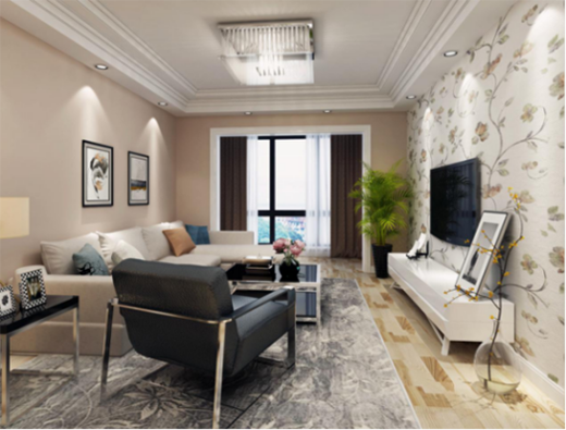 右側(cè)鳥語花香的墻面背景,營造出一個綠意盎然、生機勃勃的空間;精美絕倫的燈飾,桌上擺放的綠植,襯托出舒適溫馨的居住環(huán)境。?