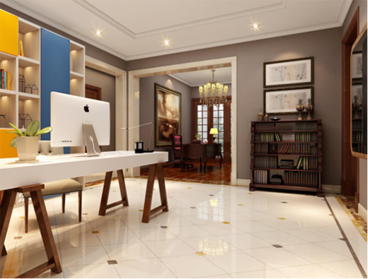 簡單的白色長方形書桌,延伸了書房的整體空間;青春亮麗的藍黃書架,給整個空間帶來煥然一新的視覺效果。
