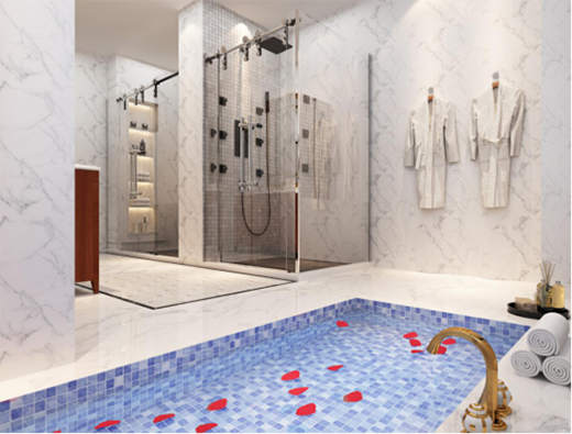 衛(wèi)生間采用玻璃隔斷,隔開了洗浴和洗漱空間,干濕分明保持了空間的干凈整潔。內(nèi)嵌式的浴缸設(shè)計,撒上少許玫瑰花瓣,陣陣清香撲面而來,增添了不少生活趣味。