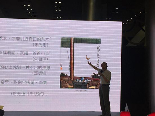 這是他的一幅漫畫《人散后,一鉤新月天如水》,這幅畫非常有名,但在一些藝術(shù)家看來(lái)有一些爭(zhēng)論:豐先生畫的非常好,但星月不是這樣的,方向畫反了。很多人給他辯解,說豐子愷先生是藝術(shù)家他不是科學(xué)家,也可能畫反了,畫畫好了就行,不能對(duì)他過于苛求。三年前我到國(guó)家天文臺(tái),經(jīng)過論證,國(guó)家天文臺(tái)的原臺(tái)長(zhǎng)院士幾個(gè)人跟我說豐老先生這幅畫是對(duì)的,“幾個(gè)朋友喝酒喝到半夜以后星月就是這樣的,豐先生不是科學(xué)家,但他是一個(gè)藝術(shù)家,他的藝術(shù)觀察不會(huì)錯(cuò),這個(gè)畫是對(duì)的?!彼麄兘忉尩?。