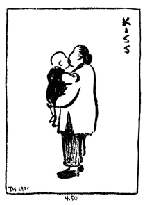 這張畫老奶奶抱著外孫子親嘴,他沒有把親嘴的動(dòng)作詳細(xì)畫出來(lái),而是畫兩條線相交在一起,讓人看了以后不會(huì)覺得不合理,反而感受到這個(gè)老奶奶真的很喜歡自己的外孫子。那時(shí)候紡紗紡線,不但沒有畫出嘴和鼻子,連眼睛也沒畫出來(lái),但是卻活靈活現(xiàn),筆不到,意就已經(jīng)到了。他說過,作畫意在筆先。