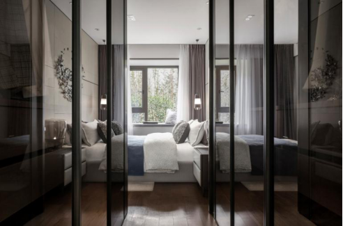 步入式衣帽間,灰色玻璃代替實(shí)質(zhì)柜門(mén),實(shí)現(xiàn)交相映射,有效提升空間通透感,且極富趣味性與神秘感。